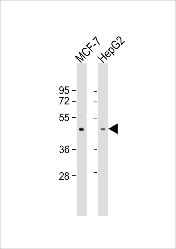 All lanes : Anti-PEX10 Antibody at 1:1000 dilution Lane 1: MCF-7 whole cell lysate Lane 2: HepG2 whole cell lysate Lysates/proteins at 20 μg per lane. Secondary Goat Anti-Rabbit IgG, (H+L),Peroxidase conjugated at 1/10000 dilution. Predicted band size : 37 kDa Blocking/Dilution buffer: 5% NFDM/TBST. |
