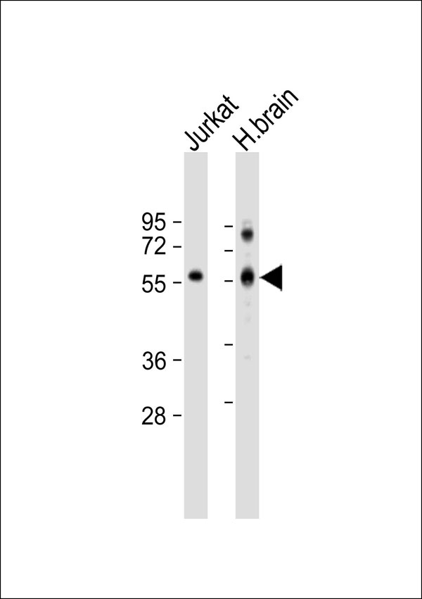 All lanes : Anti-Clipin A Antibody at 1:500 dilution Lane 1: Jurkat whole cell lysate Lane 2: human brain lysate Lysates/proteins at 20 μg per lane. Secondary Goat Anti-Rabbit IgG, (H+L),Peroxidase conjugated at 1/10000 dilution. Predicted band size : 51 kDa Blocking/Dilution buffer: 5% NFDM/TBST. |