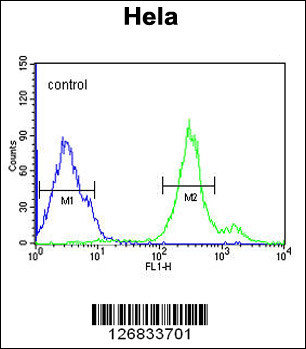 CYC1 Antibody (C-term) (Cat. APG02850G) flow cytometric analysis of Hela cells (right histogram) compared to a negative control cell (left histogram).FITC-conjugated goat-anti-rabbit secondary antibodies were used for the analysis. |