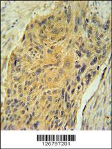 AVP Antibody (Center) (Cat. APG03184G) immunohistochemistry analysis in formalin fixed and paraffin embedded human lung carcinoma followed by peroxidase conjugation of the secondary antibody and DAB staining. This data demonstrates the use of the AVP Antibody (Center) for immunohistochemistry. Clinical relevance has not been evaluated.