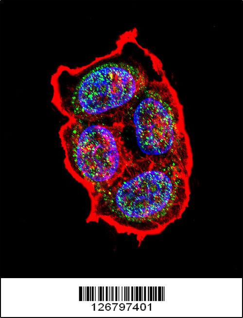 Confocal immunofluorescent analysis of AVP Antibody (Center)( APG03184G) with ZR-75-1 cell followed by Alexa Fluor 488-conjugated goat anti-rabbit lgG (green).Actin filaments have been labeled with Alexa Fluor 555 phalloidin (red).DAPI was used to stain the cell nuclear (blue). |