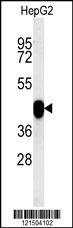 PON2 Antibody (Center) (Cat. AMR09439G) western blot analysis in HepG2 cell line lysates (15ug/lane).This demonstrates the PON2 antibody detected PON2 protein (arrow).