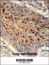 C4orf31 Antibody (N-term) (Cat. APR11261G) immunohistochemistry analysis in formalin fixed and paraffin embedded human lung carcinoma followed by peroxidase conjugation of the secondary antibody and DAB staining. This data demonstrates the use of the C4orf31 Antibody (N-term) for immunohistochemistry. Clinical relevance has not been evaluated.