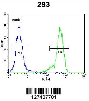 C4orf31 Antibody (N-term) (Cat. APR11261G) flow cytometric analysis of 293 cells (right histogram) compared to a negative control cell (left histogram).FITC-conjugated goat-anti-rabbit secondary antibodies were used for the analysis. |