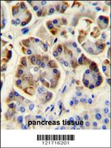 KCNJ6 Antibody (Center) (Cat. AMM06130G) immunohistochemistry analysis in formalin fixed and paraffin embedded human pancreas tissue followed by peroxidase conjugation of the secondary antibody and DAB staining. This data demonstrates the use of the KCNJ6 Antibody (Center) for immunohistochemistry. Clinical relevance has not been evaluated.