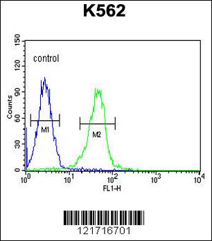 KCNJ6 Antibody (Center) (Cat. AMM06130G) flow cytometric analysis of K562 cells (right histogram) compared to a negative control cell (left histogram).FITC-conjugated goat-anti-rabbit secondary antibodies were used for the analysis. |