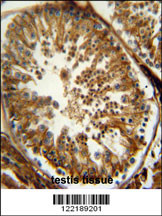 PAOX antibody (Center) (Cat. APR17750G) immunohistochemistry analysis in formalin fixed and paraffin embedded human testis tissue followed by peroxidase conjugation of the secondary antibody and DAB staining. This data demonstrates the use of the PAOX antibody (Center) for immunohistochemistry. Clinical relevance has not been evaluated. |