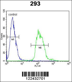 TAC1 Antibody (C-term) (Cat. APR10371G) flow cytometric analysis of 293 cells (right histogram) compared to a negative control cell (left histogram).FITC-conjugated goat-anti-rabbit secondary antibodies were used for the analysis. |