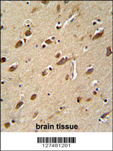 MYLK4 antibody (C-term) (Cat. APR17502G) immunohistochemistry analysis in formalin fixed and paraffin embedded human brain tissue followed by peroxidase conjugation of the secondary antibody and DAB staining. This data demonstrates the use of the MYLK4 antibody (C-term) for immunohistochemistry. Clinical relevance has not been evaluated. |