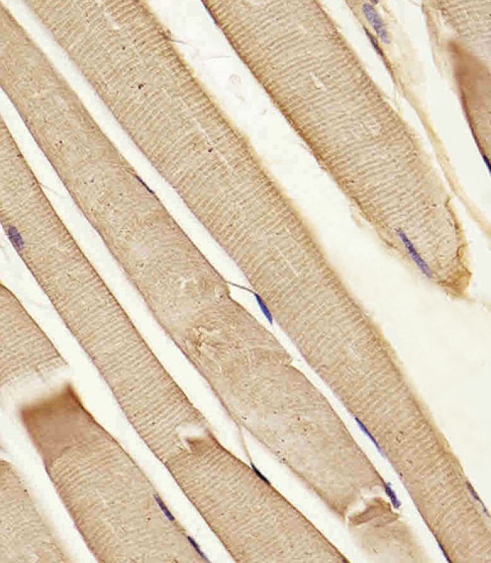 APG01404G staining hABCB10 in Human skeletal muscle tissue sections by Immunohistochemistry (IHC-P - paraformaldehyde-fixed, paraffin-embedded sections). Tissue was fixed with formaldehyde and blocked with 3% BSA for 0. 5 hour at room temperature; antigen retrieval was by heat mediation with a citrate buffer (pH6). Samples were incubated with primary antibody (1/25) for 1 hours at 37°C. A undiluted biotinylated goat polyvalent antibody was used as the secondary antibody.