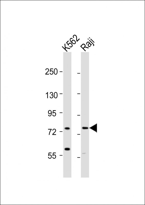 All lanes : Anti-ABCB10 Antibody (S16) at 1:1000-1:2000 dilution Lane 1: K562 whole cell lysates Lane 2: Raji whole cell lysates Lysates/proteins at 20 μg per lane. Secondary Goat Anti-Rabbit IgG, (H+L), Peroxidase conjugated at 1/10000 dilution Predicted band size : 79 kDa Blocking/Dilution buffer: 5% NFDM/TBST.