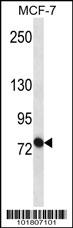 ABCB10 Antibody (S16) (Cat. APG01404G) western blot analysis in MCF-7 cell line lysates (35ug/lane).This demonstrates the ABCB10 antibody detected the ABCB10 protein (arrow). |