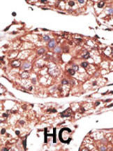 Formalin-fixed and paraffin-embedded human cancer tissue reacted with the primary antibody, which was peroxidase-conjugated to the secondary antibody, followed by AEC staining. This data demonstrates the use of this antibody for immunohistochemistry; clinical relevance has not been evaluated. BC = breast carcinoma; HC = hepatocarcinoma. |