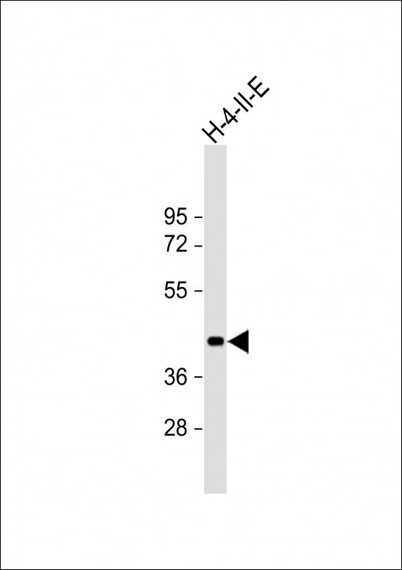 Anti-SIRT7 Antibody (C-term) at 1:2000 dilution + H-4-II-E whole cell lysate Lysates/proteins at 20 μg per lane. Secondary Goat Anti-Rabbit IgG, (H+L), Peroxidase conjugated at 1/10000 dilution. Predicted band size : 45 kDa Blocking/Dilution buffer: 5% NFDM/TBST.