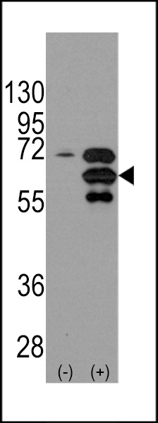 Western blot analysis of INA (arrow) using rabbit polyclonal INA Antibody (Center) (Cat. APR12432G). 293 cell lysates (2 ug/lane) either nontransfected (Lane 1) or transiently transfected with the INA gene (Lane 2) (Origene Technologies).