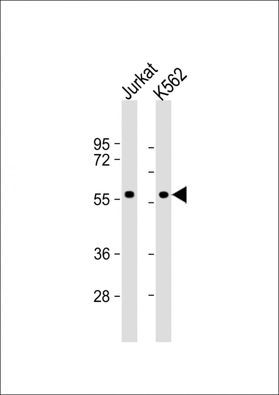 All lanes : Anti-MEF2C Antibody (S396) at 1:1000 dilution Lane 1: Jurkat whole cell lysate Lane 2: K562 whole cell lysate Lysates/proteins at 20 μg per lane. Secondary Goat Anti-Rabbit IgG, (H+L), Peroxidase conjugated at 1/10000 dilution. Predicted band size : 51 kDa Blocking/Dilution buffer: 5% NFDM/TBST.
