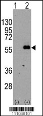 Western blot analysis of MEF2C (arrow) using rabbit polyclonal MEF2C Antibody (S396) (RB11048). 293 cell lysates (2 ug/lane) either nontransfected (Lane 1) or transiently transfected with the MEF2C gene (Lane 2) (Origene Technologies). |