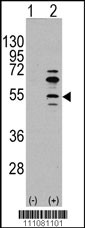 Western blot analysis of MEF2C (arrow) using rabbit polyclonal MEF2C Antibody (S59) (RB11081). 293 cell lysates (2 ug/lane) either nontransfected (Lane 1) or transiently transfected with the MEF2C gene (Lane 2) (Origene Technologies). |