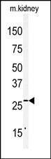 Western blot analysis of anti-CLDN2 Antibody (C-term) (Cat. APR15465G) in mouse kidney tissue lysates (35ug/lane). CLDN2(arrow) was detected using the purified Pab. |