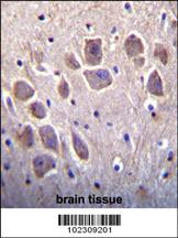 DSCR1L1 antibody (N-term) (Cat. APR11269G)immunohistochemistry analysis in formalin fixed and paraffin embedded human brain tissue followed by peroxidase conjugation of the secondary antibody and DAB staining.This data demonstrates the use of DSCR1L1 antibody (N-term) for immunohistochemistry. Clinical relevance has not been evaluated. |