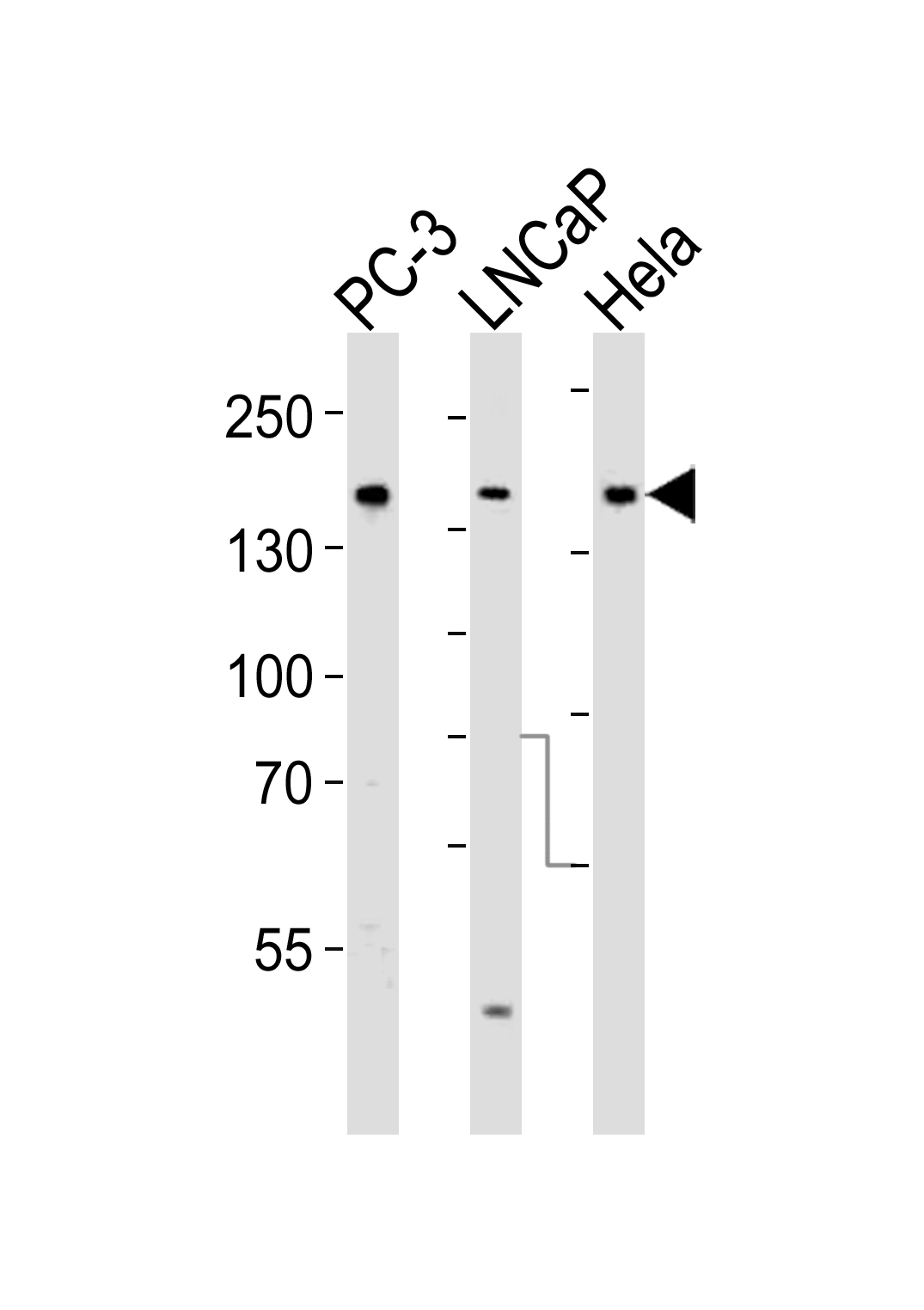 Western blot analysis of lysates from PC-3, LNCaP, Hela cell line (from left to right), using Tuberin (TSC2) Antibody( APR10606G). APR10606G was diluted at 1:1000 at each lane. A goat anti-rabbit IgG H&L(HRP) at 1:5000 dilution was used as the secondary antibody. Lysates at 35ug per lane.