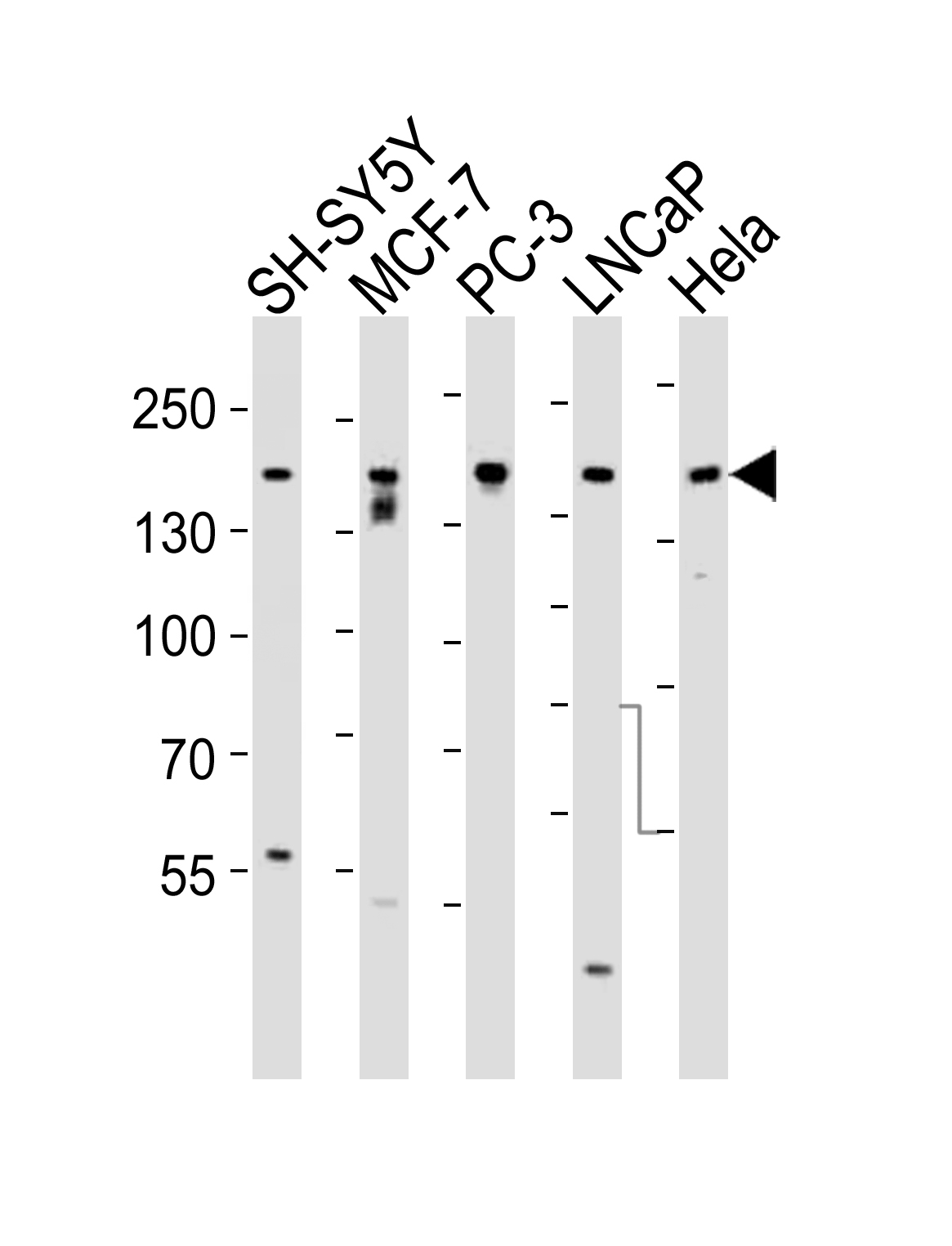 Western blot analysis of lysates from SH-SY5Y, MCF-7, PC-3, LNCaP, Hela, cell line (from left to right), using Tuberin (TSC2) Antibody( APR10606G). APR10606G was diluted at 1:1000 at each lane. A goat anti-rabbit IgG H&L(HRP) at 1:5000 dilution was used as the secondary antibody. Lysates at 35ug per lane.