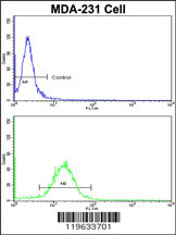 Flow cytometric analysis of MDA-231 cells using FABP3 Antibody (N-term)(bottom histogram) compared to a negative control cell (top histogram). FITC-conjugated goat-anti-rabbit secondary antibodies were used for the analysis. |