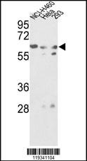 Western blot analysis of GNS Antibody (Center S298) (Cat. AMM04845G) in NCI-H460, Hela, 293 cell line lysates (35ug/lane). GNS (arrow) was detected using the purified Pab.