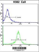 Flow cytometric analysis of K562 cells using TALDO1 Antibody (Center)(bottom histogram) compared to a negative control cell (top histogram). FITC-conjugated goat-anti-rabbit secondary antibodies were used for the analysis. |