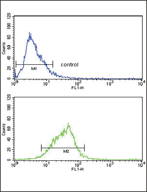AOX1 Antibody (Center) (Cat. APG01897G) flow cytometry analysis of HepG2 cells (bottom histogram) compared to a negative control cell (top histogram). FITC-conjugated goat-anti-rabbit secondary antibodies were used for the analysis. |