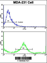 Flow cytometric analysis of MDA-231 cells using KRT4 Antibody (C-term)(bottom histogram) compared to a negative control cell (top histogram). FITC-conjugated goat-anti-rabbit secondary antibodies were used for the analysis. |
