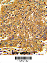 Formalin-fixed and paraffin-embedded human lung carcinoma with Fascin Antibody (Center), which was peroxidase-conjugated to the secondary antibody, followed by DAB staining. This data demonstrates the use of this antibody for immunohistochemistry; clinical relevance has not been evaluated.