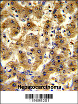 Formalin-fixed and paraffin-embedded human hepatocarcinoma reacted with ADH1B Antibody (Center), which was peroxidase-conjugated to the secondary antibody, followed by DAB staining. This data demonstrates the use of this antibody for immunohistochemistry; clinical relevance has not been evaluated. |