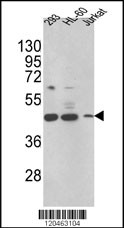 Western blot analysis of HSD17B7 Antibody (N-term) (Cat. APR07821G) in 293,HL-60,Jurkat cell line lysates (35ug/lane). HSD17B7 (arrow) was detected using the purified Pab.(2ug/ml)