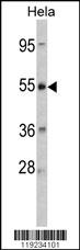 Western blot analysis of CRHR2 Antibody (Center) (Cat. AMM05792G) in Hela cell line lysates (35ug/lane). CRHR2 (arrow) was detected using the purified Pab.