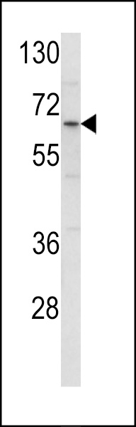 Western blot analysis of ENTH Antibody (Center) (Cat. APR15842G) in HL-60 cell line lysates (35ug/lane). ENTH (arrow) was detected using the purified Pab.