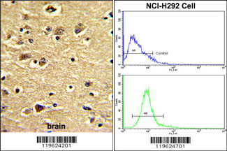 (LEFT)Formalin-fixed and paraffin-embedded human brain with ENTH Antibody (Center), which was peroxidase-conjugated to the secondary antibody, followed by DAB staining. This data demonstrates the use of this antibody for immunohistochemistry; clinical relevance has not been evaluated. (RIGHT)Flow cytometric analysis of NCI-H292 cells using ENTH Antibody (Center)(bottom histogram) compared to a negative control cell (top histogram). FITC-conjugated goat-anti-rabbit secondary antibodies were used for the analysis. |