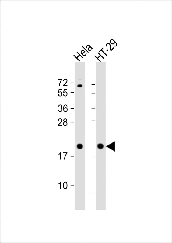 All lanes : Anti-FTH1 Antibody (C-term) at 1:1000 dilution Lane 1: Hela whole cell lysate Lane 2: HT-29 whole cell lysate Lysates/proteins at 20 μg per lane. Secondary Goat Anti-Rabbit IgG, (H+L), Peroxidase conjugated at 1/10000 dilution. Predicted band size : 21 kDa Blocking/Dilution buffer: 5% NFDM/TBST.