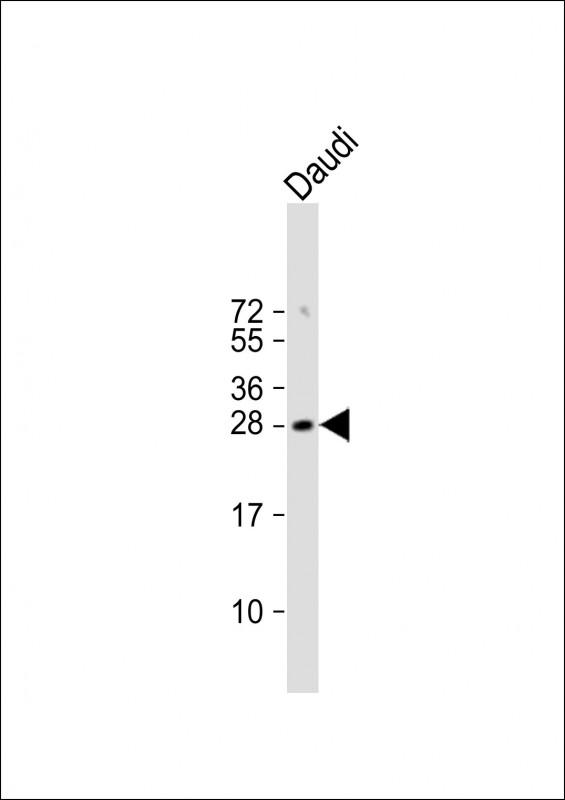 Anti-FAM3B Antibody (N-term) at 1:1000 dilution + Daudi whole cell lysate Lysates/proteins at 20 μg per lane. Secondary Goat Anti-Rabbit IgG, (H+L), Peroxidase conjugated at 1/10000 dilution. Predicted band size : 26 kDa Blocking/Dilution buffer: 5% NFDM/TBST.