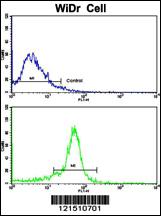 Flow cytometric analysis of widr cells using TPH1 Antibody (N-term)(bottom histogram) compared to a negative control cell (top histogram). FITC-conjugated goat-anti-rabbit secondary antibodies were used for the analysis. |