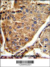 Formalin-fixed and paraffin-embedded human hepatocarcinoma reacted with HEXA Antibody (Center), which was peroxidase-conjugated to the secondary antibody, followed by DAB staining. This data demonstrates the use of this antibody for immunohistochemistry; clinical relevance has not been evaluated.