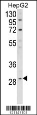Western blot analysis of DIO1 Antibody (N-term) (Cat. APR07582G) in HepG2 cell line lysates (35ug/lane). DIO1 (arrow) was detected using the purified Pab. |