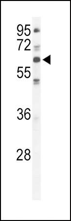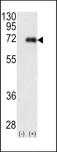 Western blot analysis of PRKCI (arrow) using rabbit polyclonal PKC iota Antibody (N-term) (Cat. APR14273G). 293 cell lysates (2 ug/lane) either nontransfected (Lane 1) or transiently transfected with the PRKCI gene (Lane 2) (Origene Technologies).