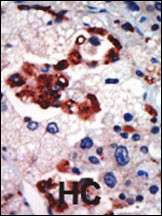 Formalin-fixed and paraffin-embedded human cancer tissue reacted with the primary antibody, which was peroxidase-conjugated to the secondary antibody, followed by AEC staining. This data demonstrates the use of this antibody for immunohistochemistry; clinical relevance has not been evaluated. BC = breast carcinoma; HC = hepatocarcinoma. |