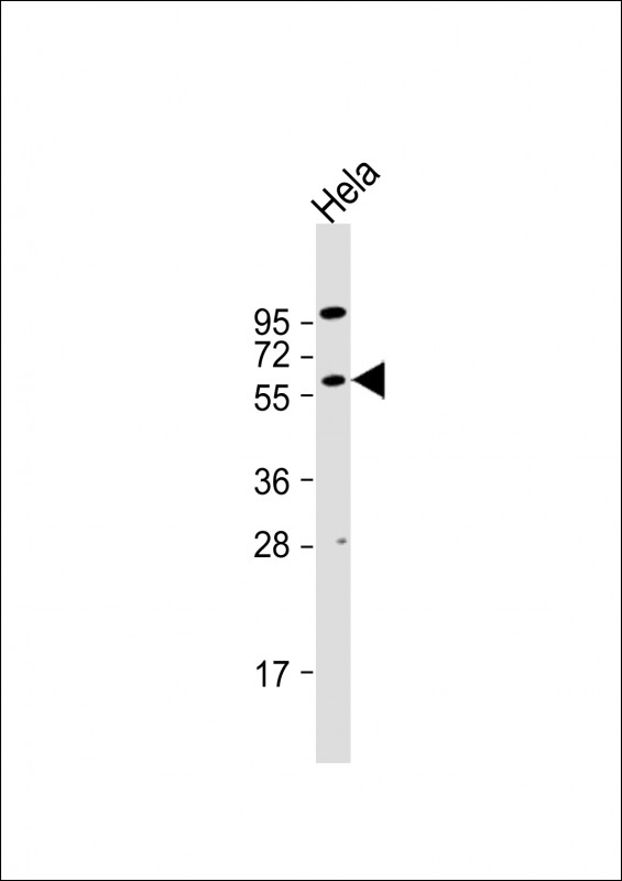 Anti-AKT2 Antibody (N-term) at 1:1000 dilution + Hela whole cell lysate Lysates/proteins at 20 μg per lane. Secondary Goat Anti-Rabbit IgG, (H+L), Peroxidase conjugated at 1/10000 dilution. Predicted band size :56 kDa Blocking/Dilution buffer: 5% NFDM/TBST.