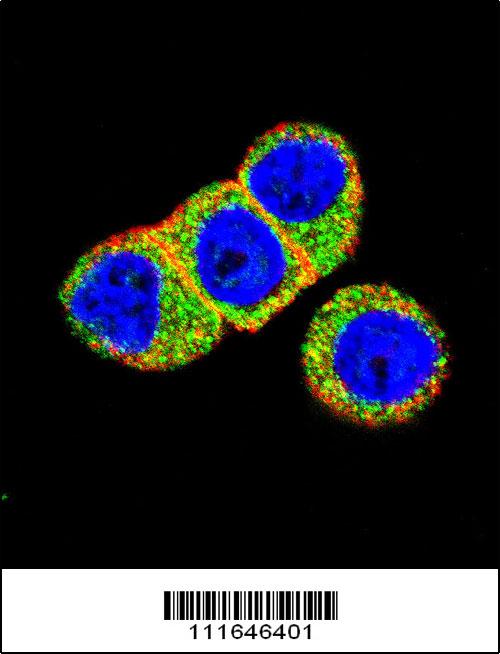 Confocal immunofluorescent analysis of AKT2 Antibody (N-term)( APG01707G) with Hela cell followed by Alexa Fluor 488-conjugated goat anti-rabbit lgG (green).Actin filaments have been labeled with Alexa Fluor 555 phalloidin (red).DAPI was used to stain the cell nuclear (blue). |