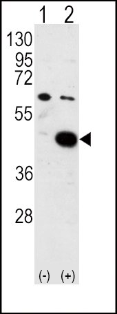 Western blot analysis of PDK2 (arrow) using PDK2 Antibody (C-term)(Cat. APR06987G). 293 cell lysates (2 ug/lane) either nontransfected (Lane 1) or transiently transfected with the PDK2 gene (Lane 2) (Origene Technologies).