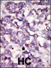Formalin-fixed and paraffin-embedded human cancer tissue reacted with the primary antibody, which was peroxidase-conjugated to the secondary antibody, followed by DAB staining. This data demonstrates the use of this antibody for immunohistochemistry; clinical relevance has not been evaluated. BC = breast carcinoma; HC = hepatocarcinoma. |