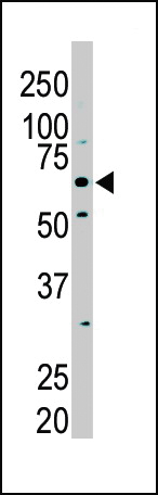 PKLR Antibody (S8) (Cat. AMR09308G) western blot analysis in NCI-H292 cell line lysates (35ug/lane).This demonstrates the PKLR antibody detected the PKLR protein (arrow).