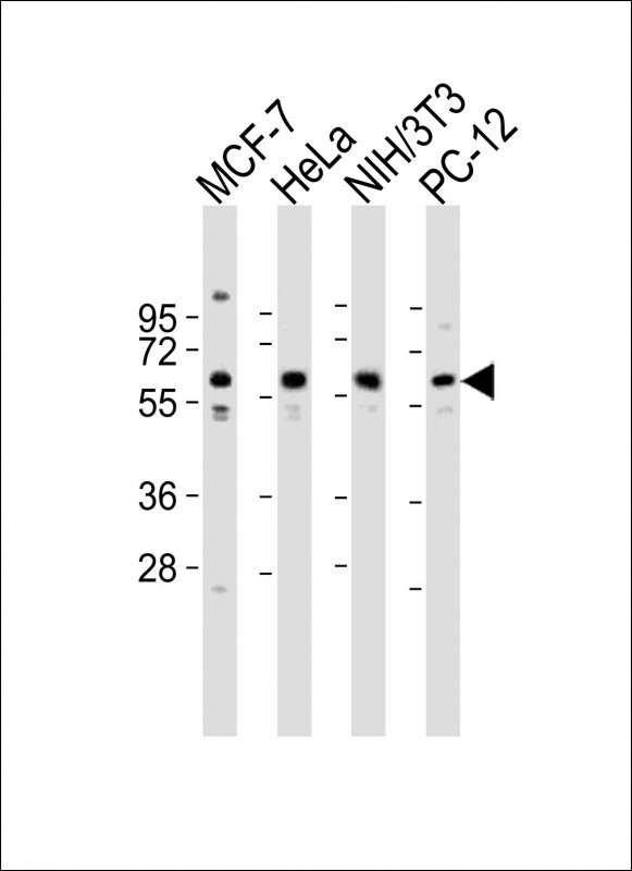 All lanes : Anti-PKM2(K136) antibody at 1:2000 dilution Lane 1: MCF-7 whole cell lysates Lane 2: Hela whole cell lysates Lane 3: NIH/3T3 whole cell lysates Lane 4: PC-12 whole cell lysates Lysates/proteins at 20 μg per lane. Secondary Goat Anti-Rabbit IgG, (H+L), Peroxidase conjugated at 1/10000 dilution Predicted band size : 58 kDa Blocking/Dilution buffer: 5% NFDM/TBST.